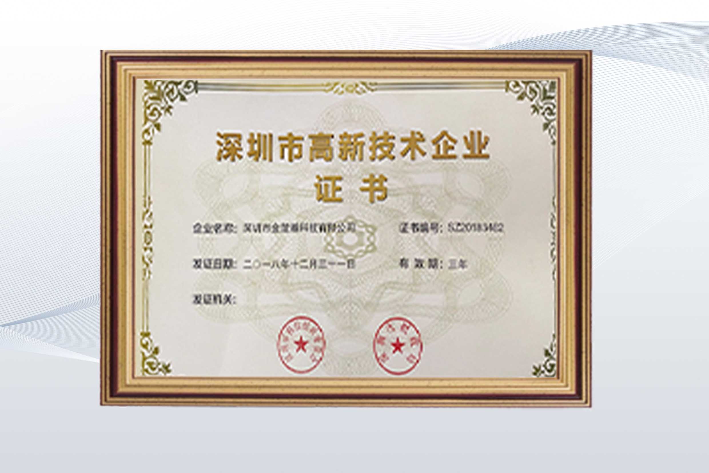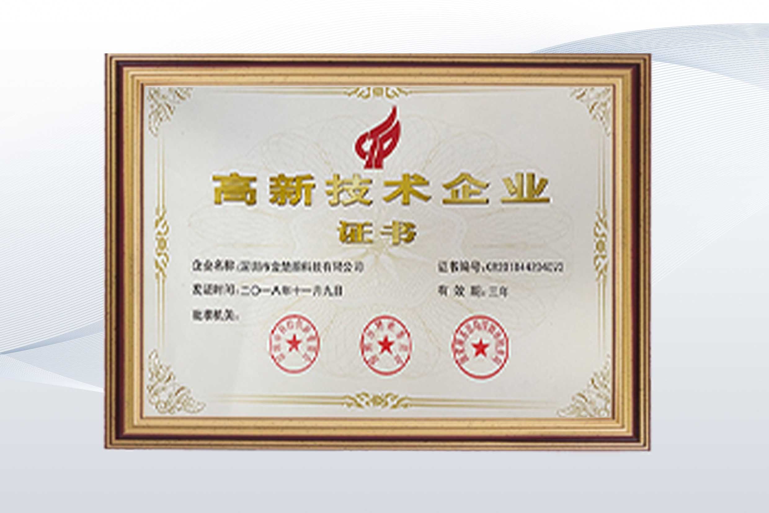 金楚瀚科技参与2018年国家高新企业评审,并成功过审,取得国家高新企业认证,证书编号为GR202144202982